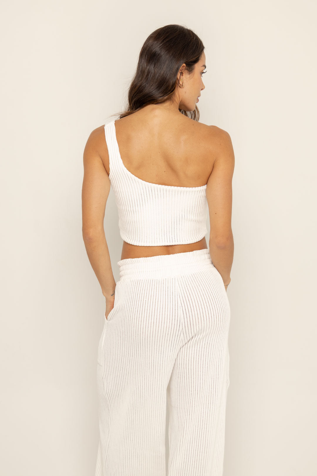 Relájate con estilo con nuestro set de loungewear. Este conjunto cómodo y moderno incluye un top corto asimétrico de un solo tirante y un pantalón jogger de tiro alto con pretina elástica y cordón ajustable. Ambos están confeccionados en tejido acanalado suave y elástico, ideal para mantener la comodidad sin perder el estilo.